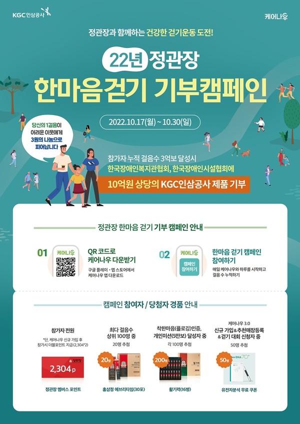캠페인은 참가자들이 3억보 이상의 총 걸음 수를 달성하면 KGC인삼공사가 10억 원 상당의 정관장 제품을 사랑의열매를 통해 장애인시설의 환절기 건강 취약계층에 기부하는 내용이다.
