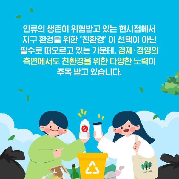 #2. 인류의 생존이 위협받는 현시점에서 지구 환경을 위한 '친환경'이 선택이 아닌 필수로 떠오르는 가운데 경제·경영 측면에서도 친환경을 위한 다양한 노력이 주목받고 있습니다.
