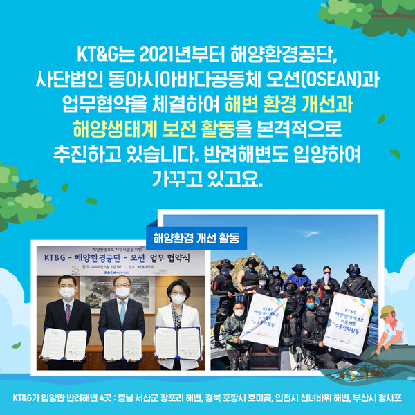#4. KT&G는 지난해부터 해양환경공단·사단법인 동아시아바다공동체 오션(OSEAN)과 업무협약을 체결하고 해변 환경 개선과 해양생태계 보전 활동을 본격 추진하고 있습니다. 충남 서산군 장포리 해변, 경북 포항시 호미곶, 인천시 선녀바위 해변, 부산시 청사포 등 반려해변 4곳도 입양해 가꾸고 있습니다.