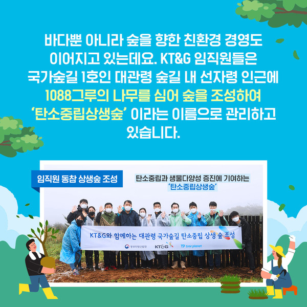 #5. 바다뿐 아니라 숲을 향한 친환경 경영도 이어지고 있습니다. KT&G 임직원은 국가숲길 1호인 대관령 숲길 내 선자령 인근에 1088그루 나무를 심어 숲을 조성하고 이를 '탄소중립상생숲'이라는 이름으로 관리하고 있습니다.