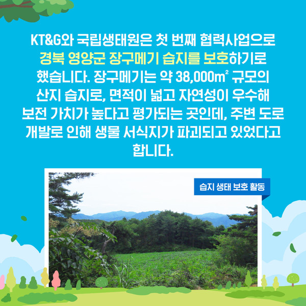 #7. KT&G와 국립생태원은 첫 번째 협력사업으로 경북 영양군 장구메기 습지를 보호하기로 했습니다. 장구메기는 약 3만8000㎡ 규모의 산지 습지입니다. 면적이 넓고 자연성이 우수해 보전 가치가 높다고 평가되는 곳이지만 주변 도로 개발로 인해 생물 서식지가 파괴되고 있었습니다.