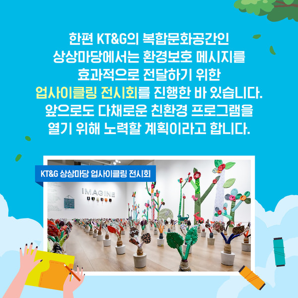 #8. KT&G의 복합문화공간인 상상마당에서는 환경보호 메시지를 효과적으로 전달하기 위한 업사이클링(Upcycling, 새활용) 전시회를 진행한 바 있습니다. KT&G는 앞으로도 다채로운 친환경 프로그램을 열기 위해 노력할 계획입니다.
