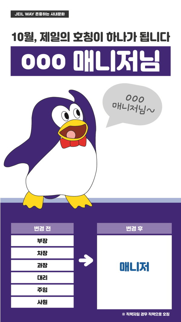 사원과 주임, 대리, 과장, 차장, 부장 등으로 불리던 직급 호칭이 매니저로 변경됐다. 유연한 소통을 통해 수평적인 조직문화를 정착시키기 위함이다. 직급 체계도 기존 7단계에서 4단계로 통합, 간소화했다.