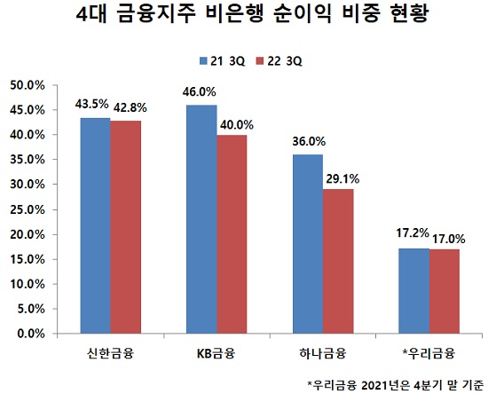 라이벌 KB금융지주는 3분기 말 기준 비은행 수익 비중이 전년 대비 6%포인트 떨어졌지만 비은행 수익 비중 40%는 지켰다.