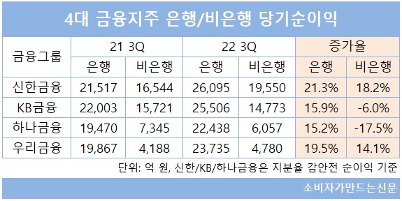 하나금융지주(회장 함영주)는 3분기 누적 비은행 순이익이 29.1%를 기록하며 전년 대비 6.9%포인트 하락했고 보험·증권 계열사가 없는 우리금융지주(회장 손태승)는 전년과 동일하게 17% 수준을 유지했다.