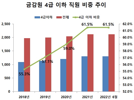 MZ세대 직원들이 상당수를 차지하는 4급 이하 하위직 비중도 매년 상승하고 있다. 지난 2018년 말 기준 금감원 4급 이하 직원 비중은 55.3%였지만 지난 6월 말 기준으로는 61.5%까지 상승했다.