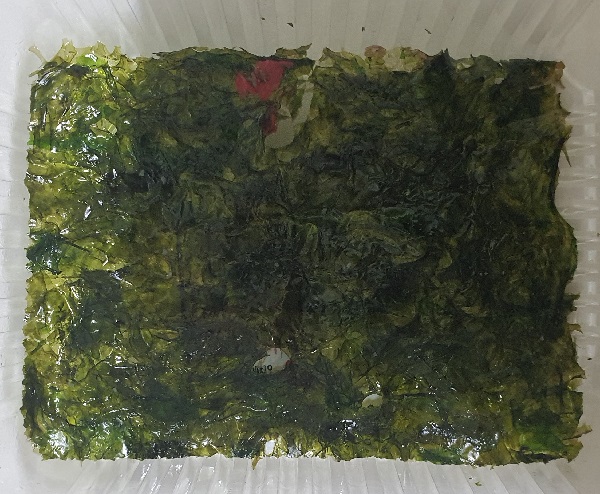 광주시에 거주하는 임 모(남)씨는 개별 포장된 조미김을 먹던 중 마지막 남은 김에 붙어 있는 빨간 이물질을 발견했다. 정체 모를 붉은 액체가 고체 형태로 굳으면서 김에 들러붙은 것으로 추정된다.