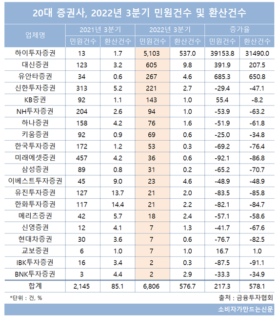 1일 금융투자협회에 따르면 올해 3분기까지 20대 증권사의 총 민원건수는 6806건으로 전년 동기 2145건 대비 3배(217.3%) 증가했다.