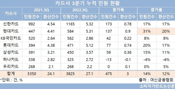 1일 여신금융협회에 따르면 전업 7개 카드사의 3분기 누적 민원건수는 3825건으로 전년 동기 3250건 대비 14% 증가했다.