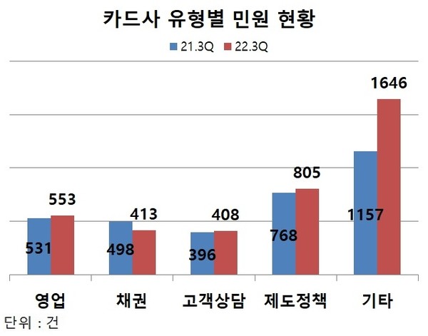 카드사의 3분기 누적 민원건수를 유형별로 살펴보면 채권을 제외한 영업, 고객상담, 제도정책, 기타 부문에서 증가한 것으로 나타났다.