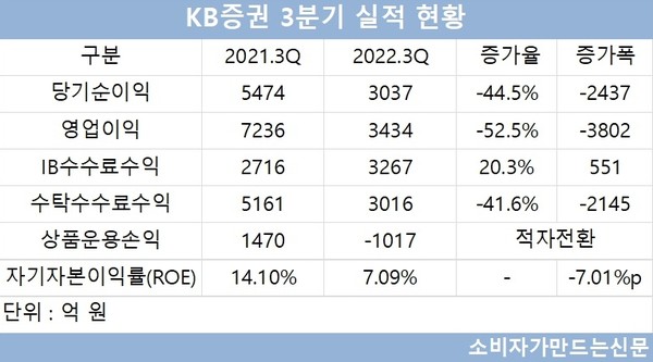 KB증권의 3분기 누적 당기순이익은 3037억 원으로 같은 기간 44.5% 감소했으며 영업이익은 3434억 원으로 같은 기간 52.5% 줄었다. 자기자본이익률(ROE)은 7.09%로 전년 대비 절반 수준에 그쳤다.