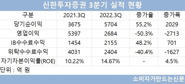 한편 신한투자증권 역시 불황 속에 큰 실적 성과를 보이지 못했다. 3분기 기준 누적 영업이익은 2684억 원으로 전년 동기 대비 50.3% 감소했고 당기순이익은 전년 동기 대비 55.2% 증가한 5704억 원을 기록했으나 이는 사옥 매각의 일회성 이익 요인이 크다.