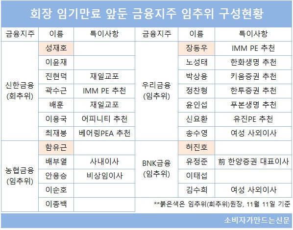 임추위원이 가장 많은 곳은 총 7명으로 구성된 신한금융지주와 우리금융지주다.
