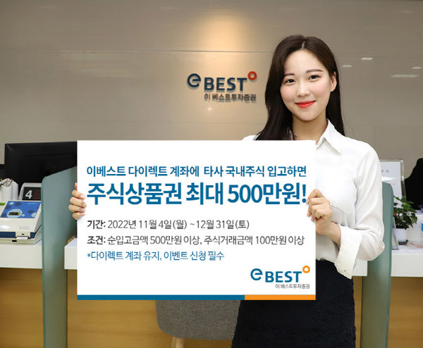 타사 계좌에 보유중인 국내 주식을 이베스트투자증권의 다이렉트 계좌로 입고하고 거래하면 금액에 따라 주식상품권이 증정된다. 최소금액은 입고 500만 원, 거래 100만 원부터이며 금액에 따라 2만 원에서 최대 500만 원까지 주식상품권을 받을 수 있다.