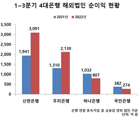 올해 3분기 말 금융업 영위 법인 기준 4대 은행 중에서 해외법인 실적이 가장 많은 곳은 신한은행이었다. 신한은행의 3분기까지 해외법인 누적 순이익은 전년 대비 60.9% 증가한 3091억 원에 달했다. 이미 지난해 연간 순이익(2568억 원)을 넘어섰다.