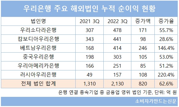 인도네시아법인 우리소다라은행은 3분기 누적 당기순이익이 전년 대비 55.9% 증가한 478억 원으로 가장 많았고 캄보디아우리은행과 베트남우리은행도 각각 누적 순이익이 441억 원과 414억 원을 기록하며 반등에 성공했다. 특히 베트남우리은행은 전년 대비 순이익이 2배 이상 급증했다.