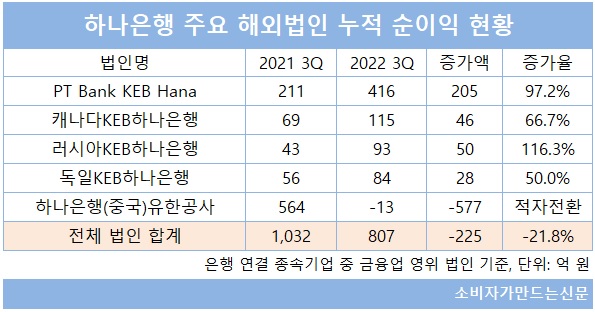 하나은행도 올해 3분기까지 누적 순이익이 전년 대비 21.7% 감소한 807억 원에 머물렀다. 주력 법인 중 하나인 중국법인(하나은행 중국유한공사)이 현지 방역정책으로 영업이 일부 중단되는 등 일회성 요인이 반영된 결과다.