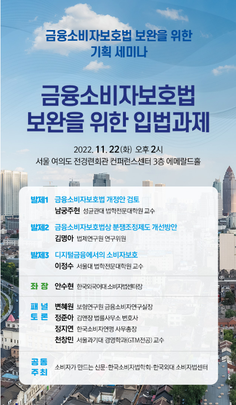 소비자가만드는신문은 한국외국어대학교 소비자법센터, 소비자법학회와 함께 오는 11월22일 오후 2시 여의도 전경련회관 컨퍼런스센터 3층 에메랄드홀에서 ‘금융소비자보호법 보완을 위한 입법과제’라는 주제로 기획 세미나를 개최한다.