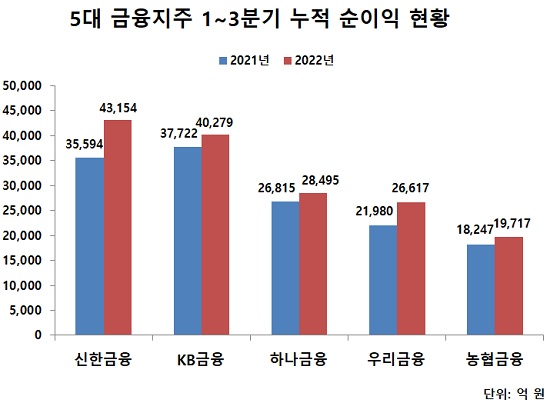 1~3분기 누적 기준 우리금융과 농협금융 순이익 격차는 3733억 원에서 6900억 원으로 약 1.8배 벌어졌다. 올 들어 금리인상과 증시불황으로 은행 계열사 수익 비중이 높은 우리금융의 수익성이 크게 늘어나면서 농협금융과의 격차를 벌렸다.