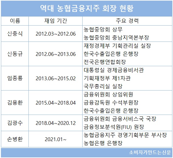 농협금융지주는 초대 회장이었던 신충식 전 회장을 제외하고는 역대 회장들이 관료 출신이었다는 점에서 당시에도 관피아 선임이 유력했지만 내부 출신인 손 회장이 임명되면서 파격 행보라는 평가가 많았다.