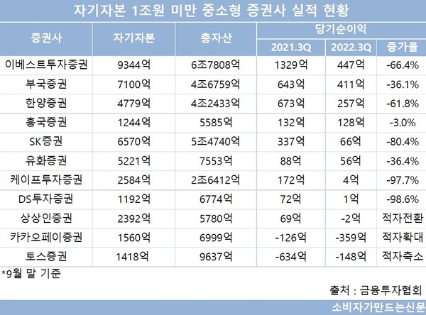금융투자협회에 따르면 자기자본 1000억 원 이상, 1조 원 미만 중소형 증권사 11곳의 3분기 누적 순이익이 일제히 감소했다.