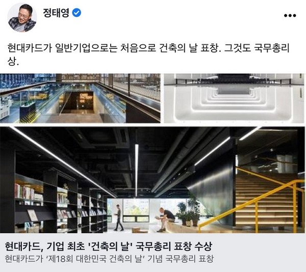 그간 건축의 날 표창이 건축계에 유의미한 족적을 남긴 건축계 원로나 건축사무소가 받아왔다는 점에서 현대카드의 국무총리 표창 수상은 매우 이례적인 일이라는 평가다.