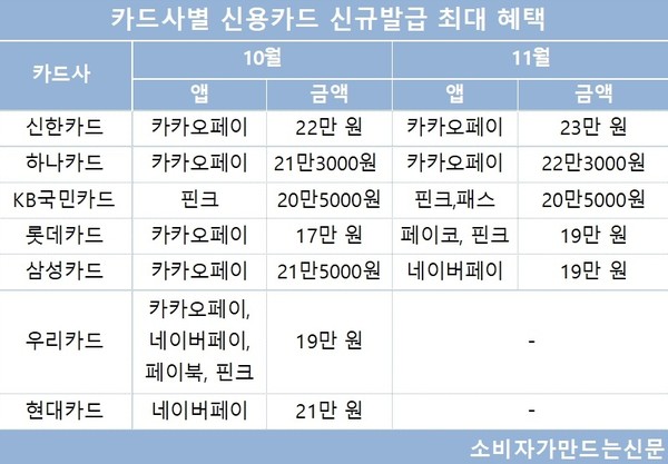 나머지 카드사들은 최대 혜택 금액을 전달에 비해 1~2만 원 정도 늘렸다. 최대 혜택은 기본 리워드에 자동납부 신청 등 추가 조건을 충족했을 때 제공된다.