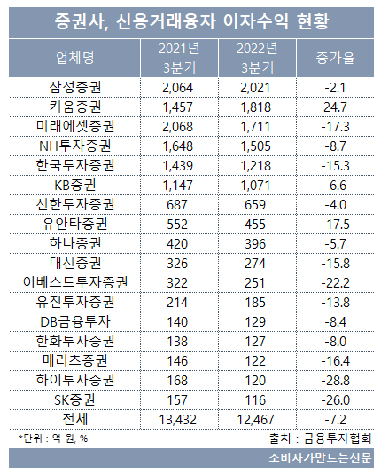 29일 금융투자협회에 따르면 3분기까지 29개 증권사가 개인 신용거래융자를 통해 벌어들인 이자수익은 1조2467억 원으로 전년 동기 1조3432억 원 대비 7.2% 감소했다.