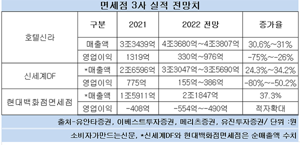 실제로 증권가는 호텔신라 면세 부문의 올해 연간 매출액은 4조3680억 원~4조3807억 원으로 전년 대비 30.6%~31% 늘어날 것으로 전망했다. 그러나 영업이익 전망치는 330억 원~976억 원으로 전년(1319억 원) 대비 26%~75% 감소할 것으로 예상했다.
