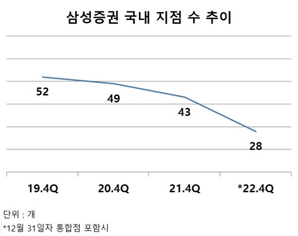지난 10월에도 7개를 정리해 이번 통폐합 지점을 반영하면 올해만 총 15개가 줄었다. 지난해 말 대비 35%가 줄어든 셈이다. 남은 점포는 28개에 불과하다. 삼성증권의 국내 지점 수는 지난 2019년 52개, 2020년 49개에서 지난해 말 43개로 감소한 바 있다.