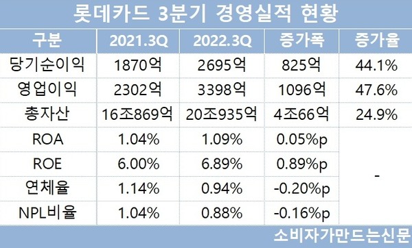 롯데카드 관계자는 "로카시리즈 누적 237만 유치 등 전략상품 중심의 이용회원수·이용효율성 증대, 리스크 관리 강화 전략에 기반한 자산건전성 개선, 지속적인 운영효율성 제고 등으로 당기순이익이 증가했다"고 밝혔다.