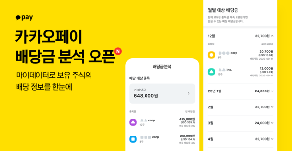 카카오페이 측은 “미국 주식 배당이 많은 12월 ‘배당금 분석’ 서비스가 사용자들로 하여금 배당금 수익 관리와 투자 전략 마련에 도움이 되기를 바란다”며 “앞으로도 카카오페이는 어려운 금융의 허들을 낮추고 사용자들이 보다 편리하고 쉽게 투자를 경험하고 자산을 관리할 수 있도록 노력할 것”이라고 밝혔다.