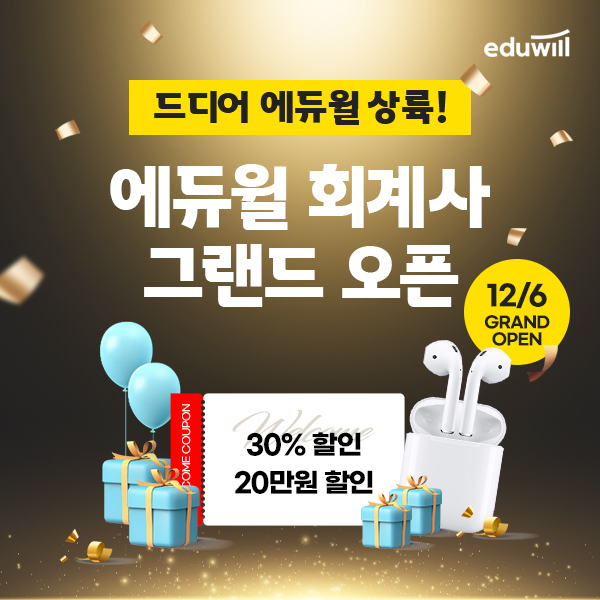 회계사 공식 오픈을 기념해 수강료 할인 쿠폰을 오는 30일까지 증정한다. 환급형의 회계사 온라인 합격패스 30% 할인 쿠폰과 에듀윌 회계사 학원에서 기본/평생반 수강 시 사용할 수 있는 20만 원 쿠폰을 모두 받아볼 수 있다.