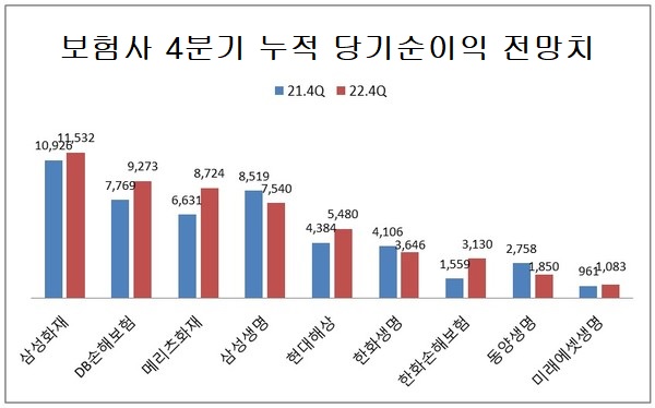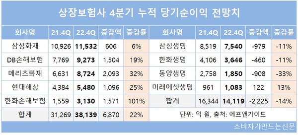 16일 에프앤가이드에 따르면 삼성생명, 삼성화재, DB손해보험, 메리츠화재, 현대해상, 한화손해보험, 한화생명, 동양생명, 미래에셋생명 등 국내 상장 보험사 9곳의 올해 4분기 누적 당기순익은 5조2258억 원으로 전년 동기 4조7613억 원 대비 4645억 원(10%) 늘어날 것으로 집계됐다.