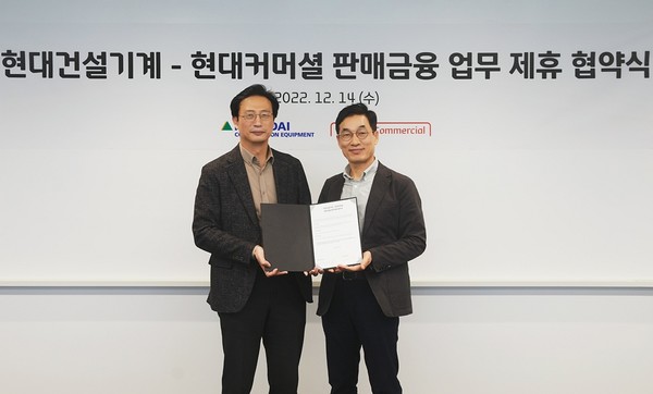 현대커머셜 장병식 대표와 현대건설기계 문재영 영업본부장(부사장)은 지난 14일 서울 여의도 현대커머셜 본사에서 열린 협약식에 참석해 ‘할부금융 업무제휴 협약’을 맺었다.