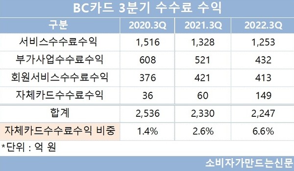20일 BC카드 분기보고서에 따르면 3분기 자체카드 수수료수익은 149억 원으로 전년 동기 60억 원 대비 148% 증가했다. 전체 수수료 수익 중 자체카드 수수료수익 비중은 6.6%로 전년 동기 2.6%보다 크게 확대됐다.