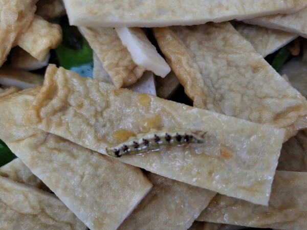 경기도 안양시에 사는 이 모(여)씨는 반찬을 만들기 위해 사각어묵 한 봉을 썰어 팬에 볶다가 아연실색 했다. 어묵 위에 길이 1.5㎝ 정도의 털 빠진 송충이 같은 벌레가 붙어 있었던 것.