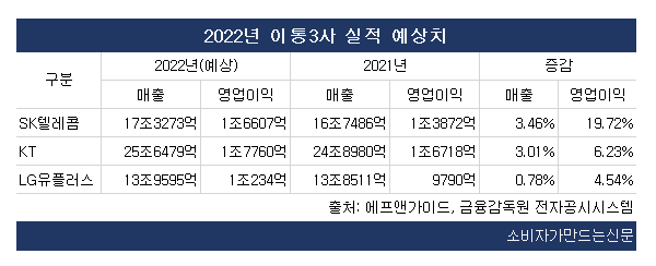 SK텔레콤(대표 유영상), KT(대표 구현모), LG유플러스(대표 황현식)가 올해 준수한 실적을 이어갈 것으로 예상된다. SK텔레콤은 20% 가량의 영업이익 성장을, LG유플러스는 사상 첫 1조 원의 영업이익을 달성할 것으로 전망된다.