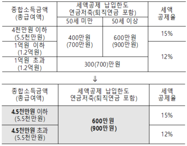 연금계좌 세제혜택도 기존 연금저축계좌 400만 원(퇴직연금 포함 700만 원)에서 600만 원(900만 원)으로 확대된다.