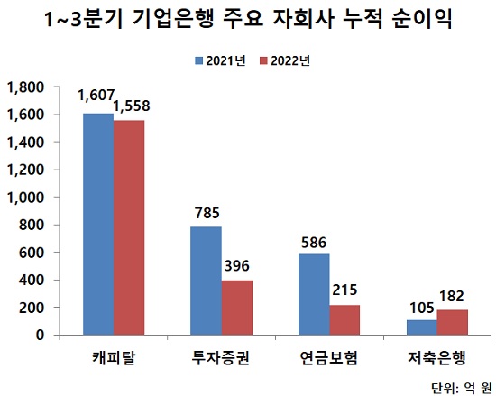올해 3분기 말 기준 기업은행 일반 자회사 당기순이익은 전년 대비 13.8% 감소한 2782억 원에 그쳤다. IBK캐피탈이 전년 대비 3% 감소한 1558억 원으로 선방했지만 IBK투자증권과 IBK연금보험은 같은 기간 당기순이익이 각각 49.6%와 63.3% 감소했다.