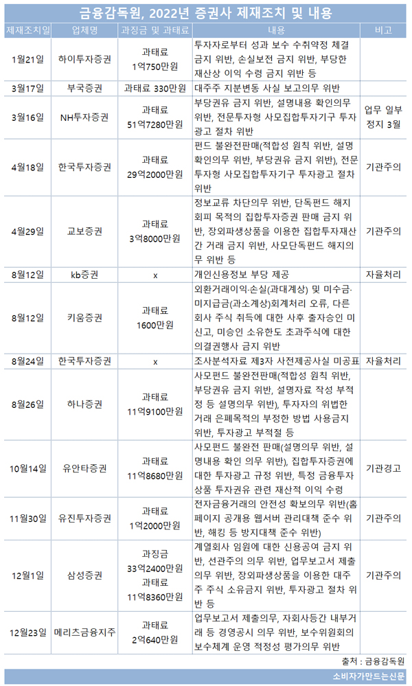 증권사 관계자는 “사모펀드 사태에 대한 당국의 징계가 이번해에 확정되면서 증권사 제재건수가 늘어난 것으로 보인다”며 “금융소비자보호법이 시행되고 내부통제 시스템이 강화된 터라 앞으로 개선될 것”이라고 설명했다.
