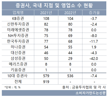 6일 금융투자협회와 각 사에 따르면 지난해 말 기준 10대 증권사의 지점 및 영업소 수는 총 536개로 전년 579개 대비 7.4% 감소했다.