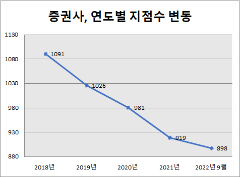 한국투자증권도 2021년 77개에서 지난해 말 68개로 9개(11.7%) 줄었고 NH투자증권은 75개에서 69개로 6개(8%) 감소했다. KB증권은 104개, 대신증권 44개로 지점 및 영업소 수가 줄었다.