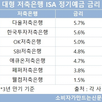 6일 업계에 따르면 대형 저축은행들이 판매 중인 ISA 예금상품 가운데 가장 높은 금리(3년 만기, 세전 기준)를 제공하는 곳은 다올저축은행으로 연 5.7%의 높은 금리를 제공하고 있다.
