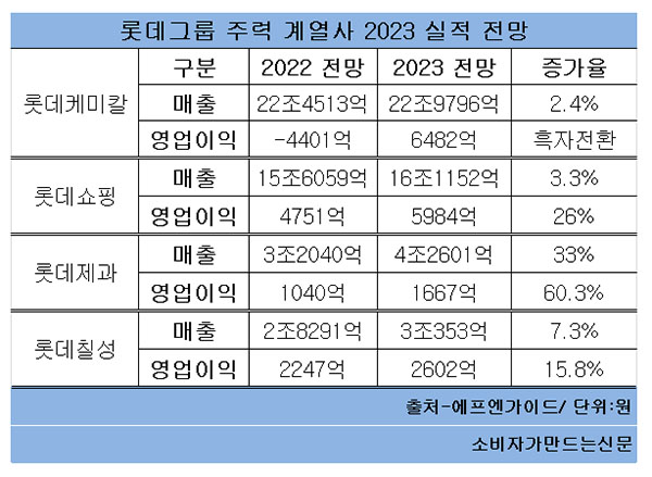 롯데의 또다른 주력사업인 롯데쇼핑은 백화점 부문에 오는 2024년까지 2조3791억 원을 투자해 백화점 1위 탈환을 노린다. 전망도 밝다. 특히 당기순이익은 흑자로 돌아설 것으로 예상된다.
