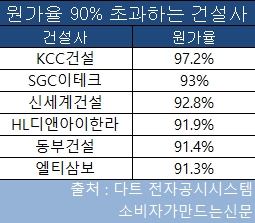 6곳 중 원가율이 가장 높은 곳은 KCC건설로 97.2%를 기록했다. 그 뒤로 SGC이테크 93%, 신세계건설 92.8%, HL디앤아이한라 91.9%, 동부건설 91.4%, 엘티삼보 91.3% 순이었다.