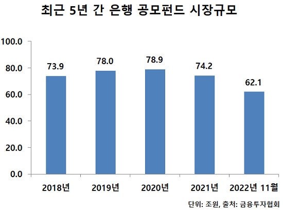 11일 금융투자협회에 따르면 지난해 11월 말 기준 은행권 공모펀드 시장 규모는 전년도 말 대비 18.4% 감소한 62조866억 원으로 크게 줄었다.