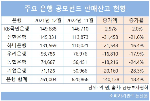 각 은행마다 공모펀드 판매잔고도 지난해 큰 폭으로 감소했다. 6대 은행 중에서는 신한은행이 지난해 11월 말 기준 전년 말 대비 3조1458억 원(-21.6%) 감소한 11조3873억 원으로 가장 많이 줄었고 하나은행과 기업은행도 같은 기간 2조 원 이상 판매잔고가 줄었다.