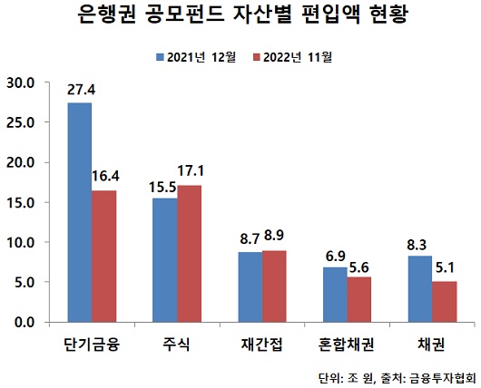 실제로 지난해 11월 말 기준 은행 공모펀드 판매잔고에서 단기금융상품 판매잔고는 전년 말 대비 무려 11조 원 감소한 16조4366억 원에 그쳤다. 단기금융상품 대부분 MMF(머니마켓펀드)로 구성되어있는 것으로 알려져있다. 공모펀드 판매잔고가 가장 많이 줄었던 신한은행의 경우 해당 기간 공모펀드 단기금융상품 잔고에서만 약 2조6000억 원 이상이 감소했다.