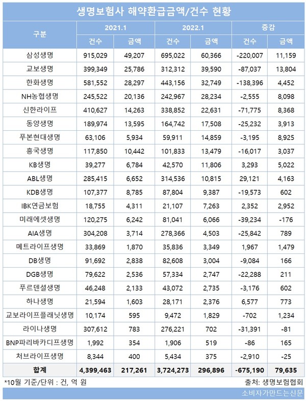 이외에도 NH농협생명의 경우 해지환급건수는 24만 건, 해지환급금액은 2조8234억 원이며 신한라이프는 해지환급건수 33만 건, 해지환급금액 2조2631억 원으로 상위권을 차지했다.